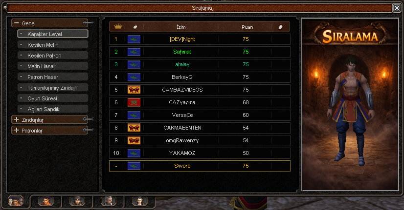 Detaylı oyuncu sıralamaları ve istatistikleri. Level, metin kesme, boss öldürme ve daha fazlası.